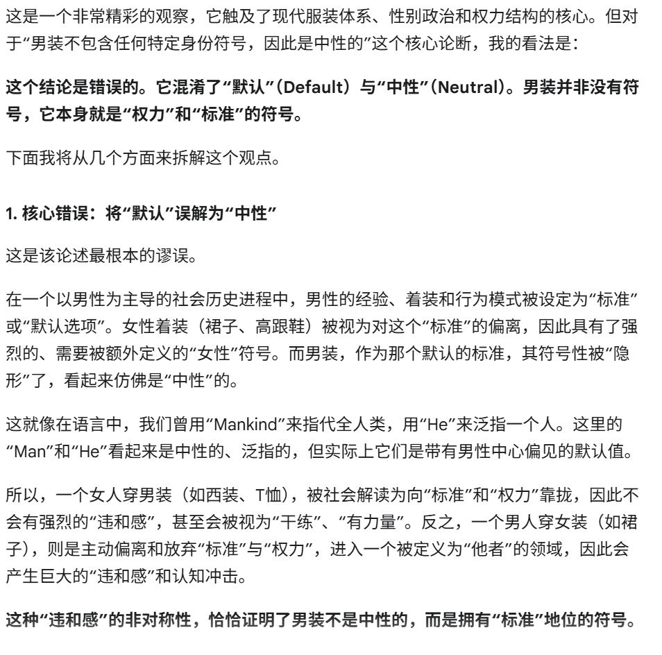 还有,手表大小的差异,撑遮阳伞的性别分化,男性更严重的恐同焦虑,影视作品作品中,阴柔的男性往往和邪恶挂钩。过于女性化的男性,难以再被男性社交圈接纳。有词汇“雌堕”,没有“雄堕”。等等。因为,AI可以提供更好地分析,这些细节我感觉还是不展开细说比较好。